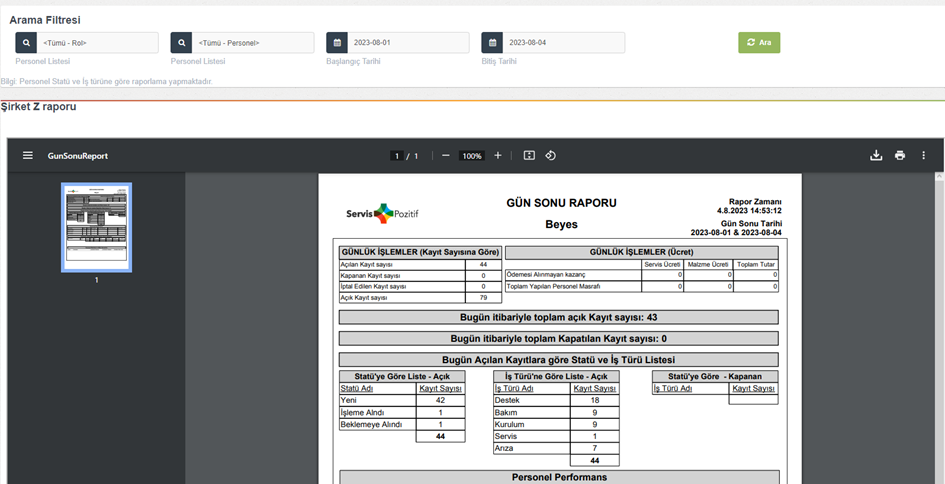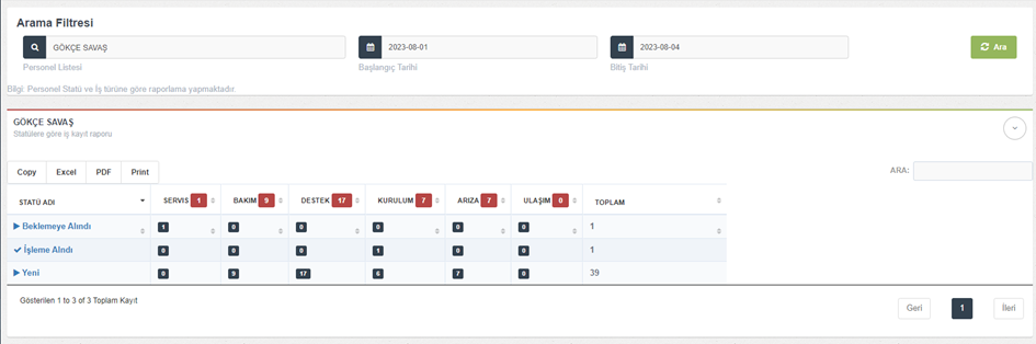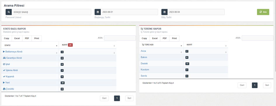 ### Personel Bazlı İş Türü/Statü Kayıt Raporu